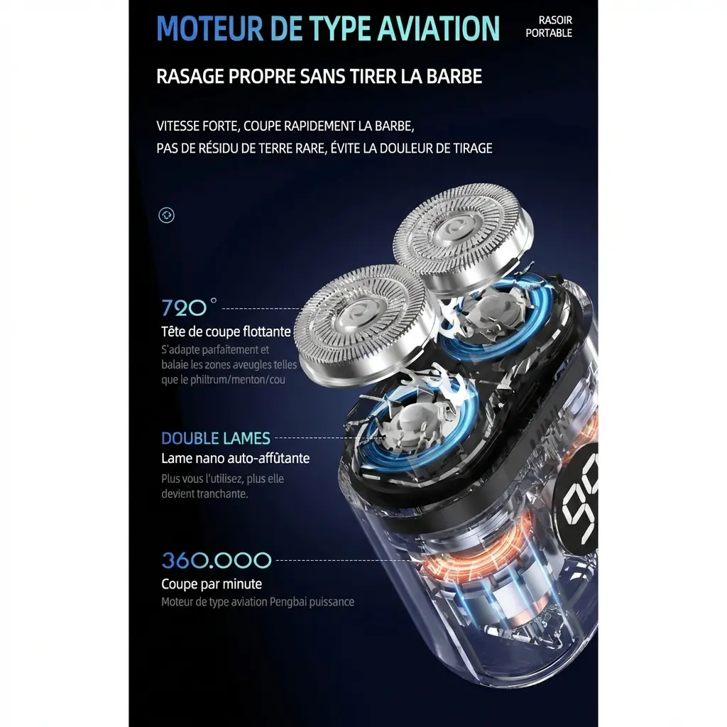 Facile a nettoyer et vraiment portable. Coupe bien mais pas pour rasage complet.