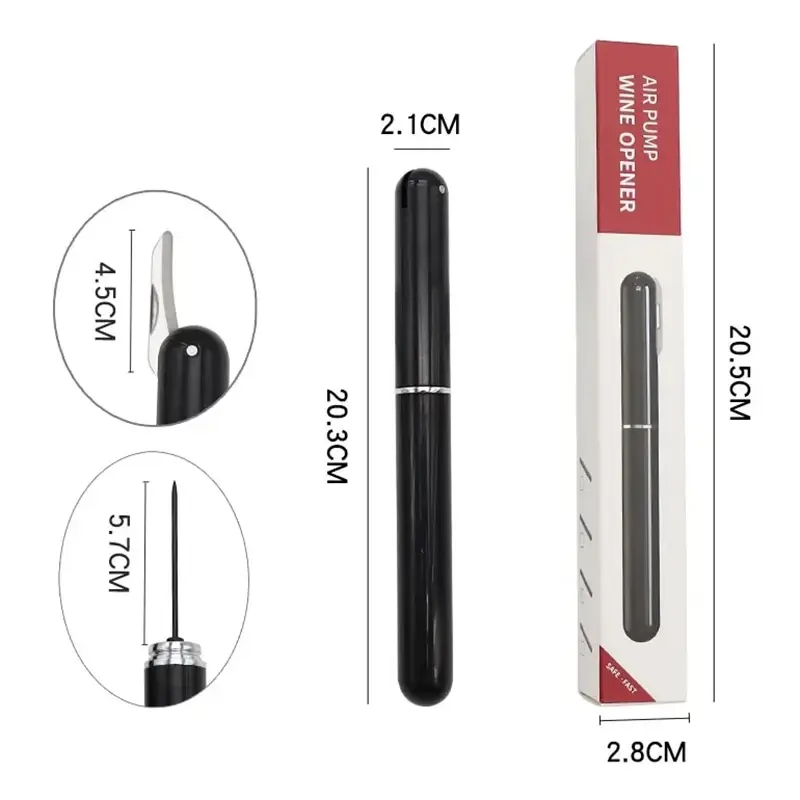 El mecanismo del Sacacorchos Portátil de Aire Comprimido se basa en una bomba de aire de alto rendimiento y una fina aguja metálica que penetra en el centro del corcho para extraerlo limpiamente. Su diseño evita que el corcho se desmenuce y protege el vino de las partículas. Tras su uso, la aguja se retrae para reducir el riesgo y garantizar una manipulación segura, especialmente en presencia de niños o ancianos.
