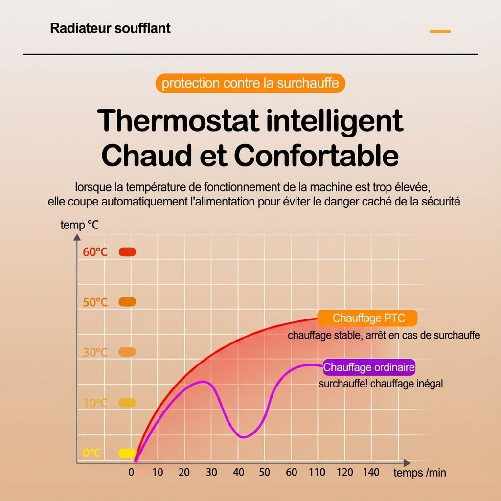 Benefíciate de un calentamiento rápido y económico: la resistencia PTC se calienta rápidamente sin ruidos molestos, limitando las molestias (ruido declarado 45-60 dB). Es fácil de usar, con dos ajustes para adaptar la potencia a tus necesidades y mantener el consumo al mínimo. Gracias a sus dimensiones compactas, se adapta a cualquier entorno para una comodidad inmediata.