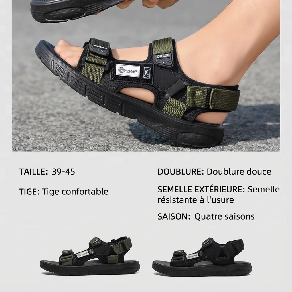 Attirez tous les regards cet été avec des sandales conçues pour durer. Ces sandales ouvertes allient un design moderne à des matériaux pensés pour la plage : tige en toile respirante, semelle en EVA et fermeture par Velcro pour un maintien simple et efficace. Disponibles en noir et noir/vert et dans les tailles 39 à 45, elles offrent une coupe adaptée aux jeunes hommes actifs. Le style épuré s’accorde avec shorts, maillots et tenues de ville décontractées pour une polyvalence optimale.