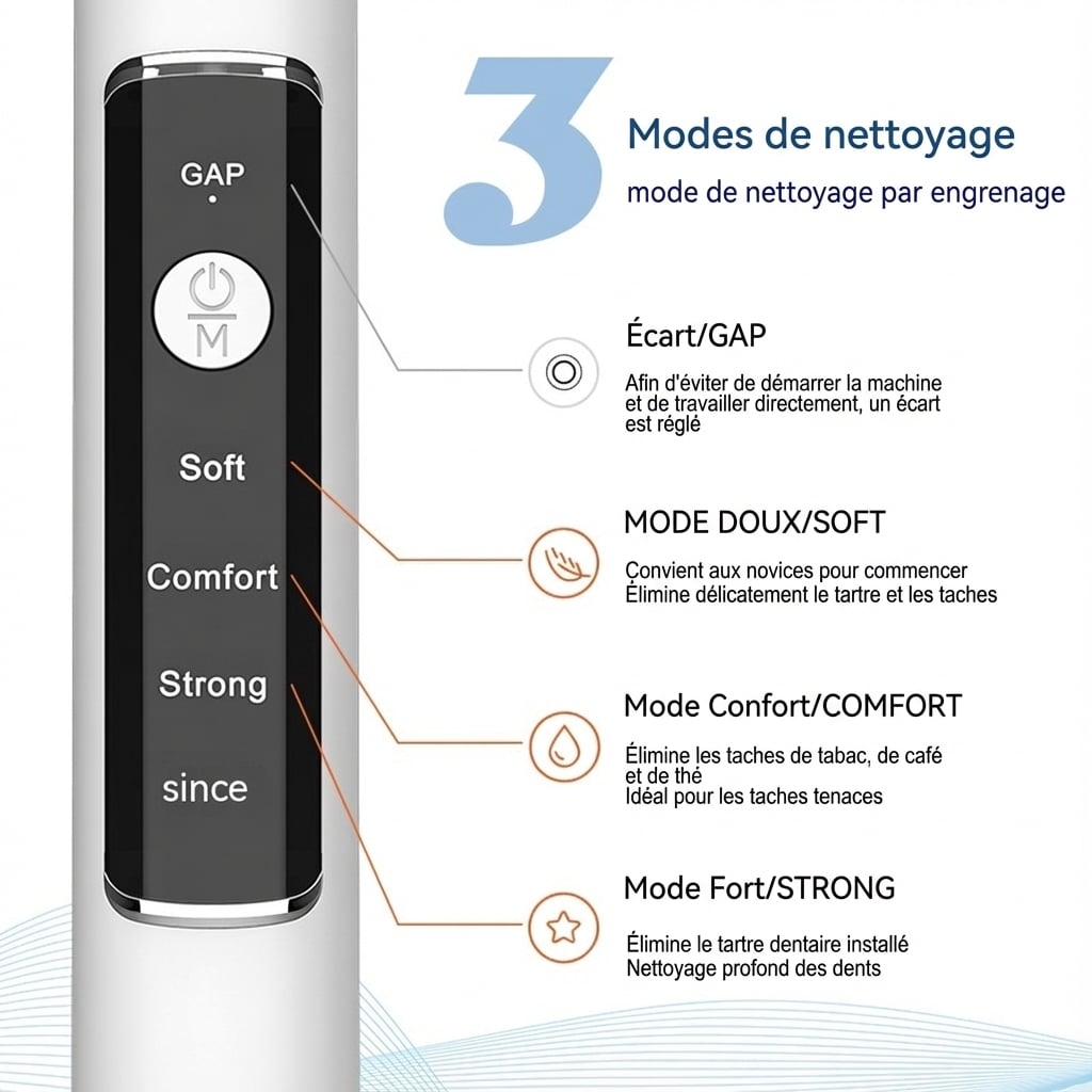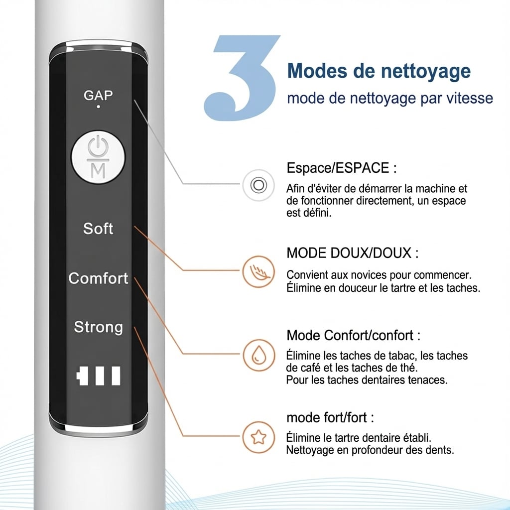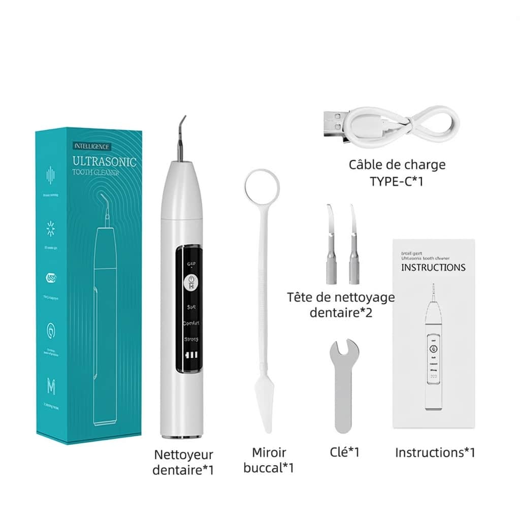Conçu avec une tête de nettoyage en matériaux médicaux, antibactériens et inoxydables, l’appareil propose 3 modes de nettoyage et une fréquence ultrasonique jusqu’à 30KHZ pour dissoudre efficacement les dépôts. Il inclut une lampe UV pour désinfection pendant la charge, un câble USB, différentes piques (pointue et plate), un miroir dentaire et une clé de maintenance pour un entretien simple et hygiénique.