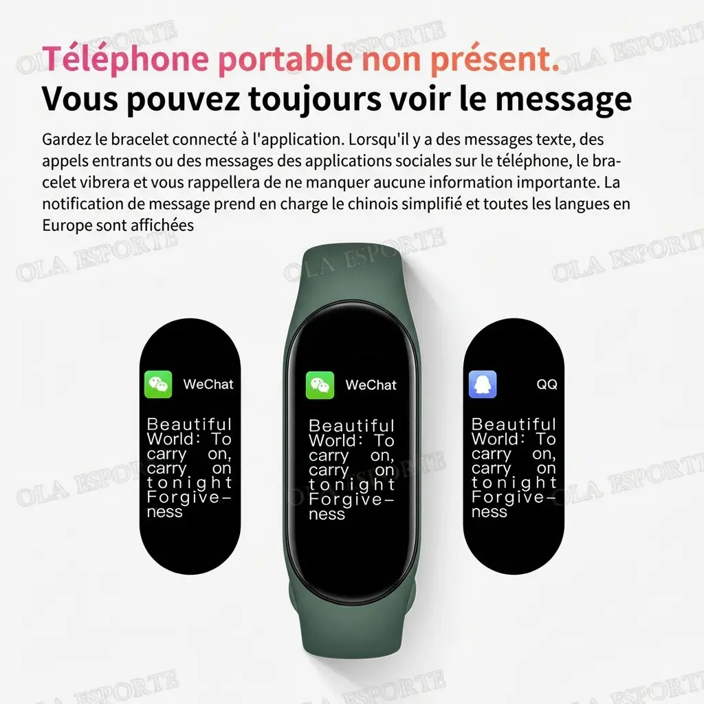 Recevez appels, SMS et notifications d’applications (WhatsApp, Facebook, Instagram, Twitter) directement au poignet. Contrôlez la musique, la caméra à distance, ou retrouvez votre bracelet en un clic : autant de fonctions pratiques qui vous évitent de sortir votre téléphone. Avec le rappel sédentaire et l’alarme, adoptez de meilleures habitudes sans effort. La montre bénéficie d’un indice d’étanchéité IP67 : résistante à la transpiration et aux éclaboussures.