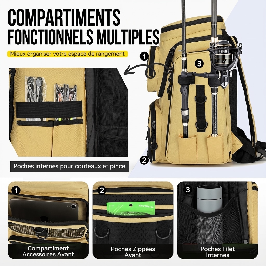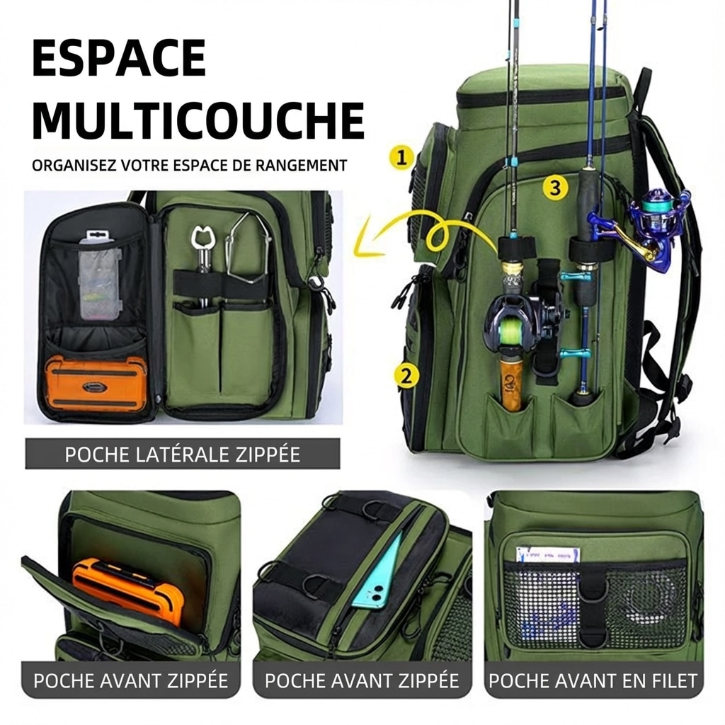 🎣 Sac à dos de pêche 50L avec supports — Prêt pour l’aventure