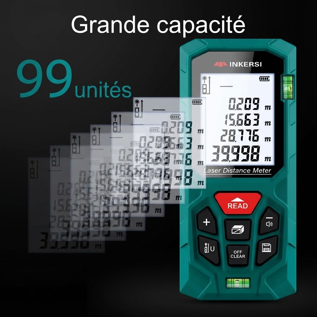 Découvrez des fonctions complètes : mesure continue, mesure d’aire, mesure de volume, ajout/soustraction, et calculs par la méthode de Pythagore pour les mesures indirectes. Options d’unité (mètre / pouce / pied) et mémoire jusqu’à 99 valeurs facilitent la gestion des relevés. La référence avant/arrière et les deux bulles de mise à niveau assurent une utilisation fiable sur tout type de surface.