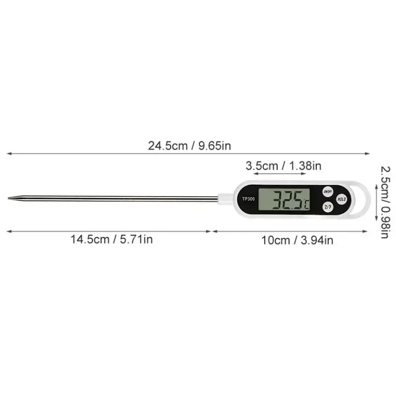 Adapté aux bars, restaurants, boulangeries ou à la cuisine domestique, ce thermomètre numérique permet des mesures fiables pour la cuisson, la réfrigération et le contrôle qualité. Sa plage étendue jusqu’à 300°C en fait un allié pour la pâtisserie et le grill. Les matériaux en acier et plastique PC garantissent une utilisation durable et une résistance optimale.